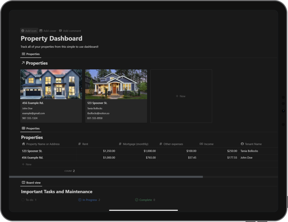 Manage your monthly property income, expenses, and maintenance from a simple to use all in one dashboard.